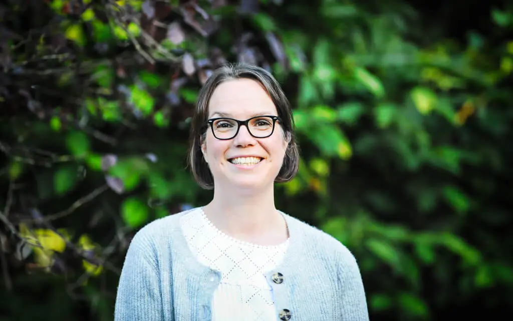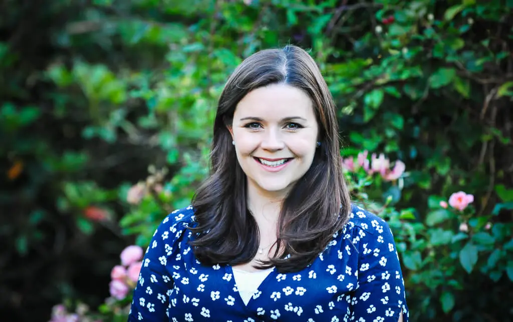 Grace, Peaches Policy and Advocacy volunteer, white female, long auburn hair, wearing blue top floral scarf and glasses