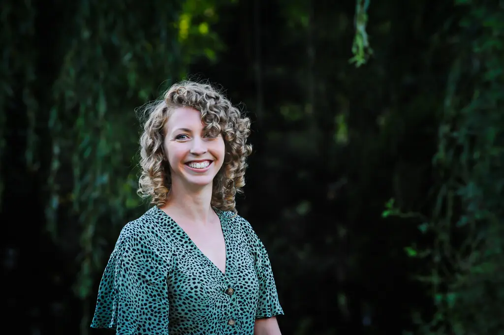 Harriet Hirst, Peaches volunteer, white female, long blonde curly hair, wearing abstract shirt and grey jacket