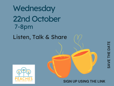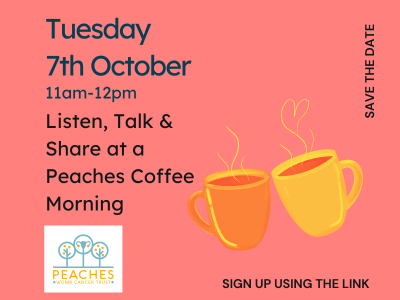 Tuesday 7th October, 11am-12 noon, online Listen, talk and sharePeaches Coffee Morning Support Group aims ...
